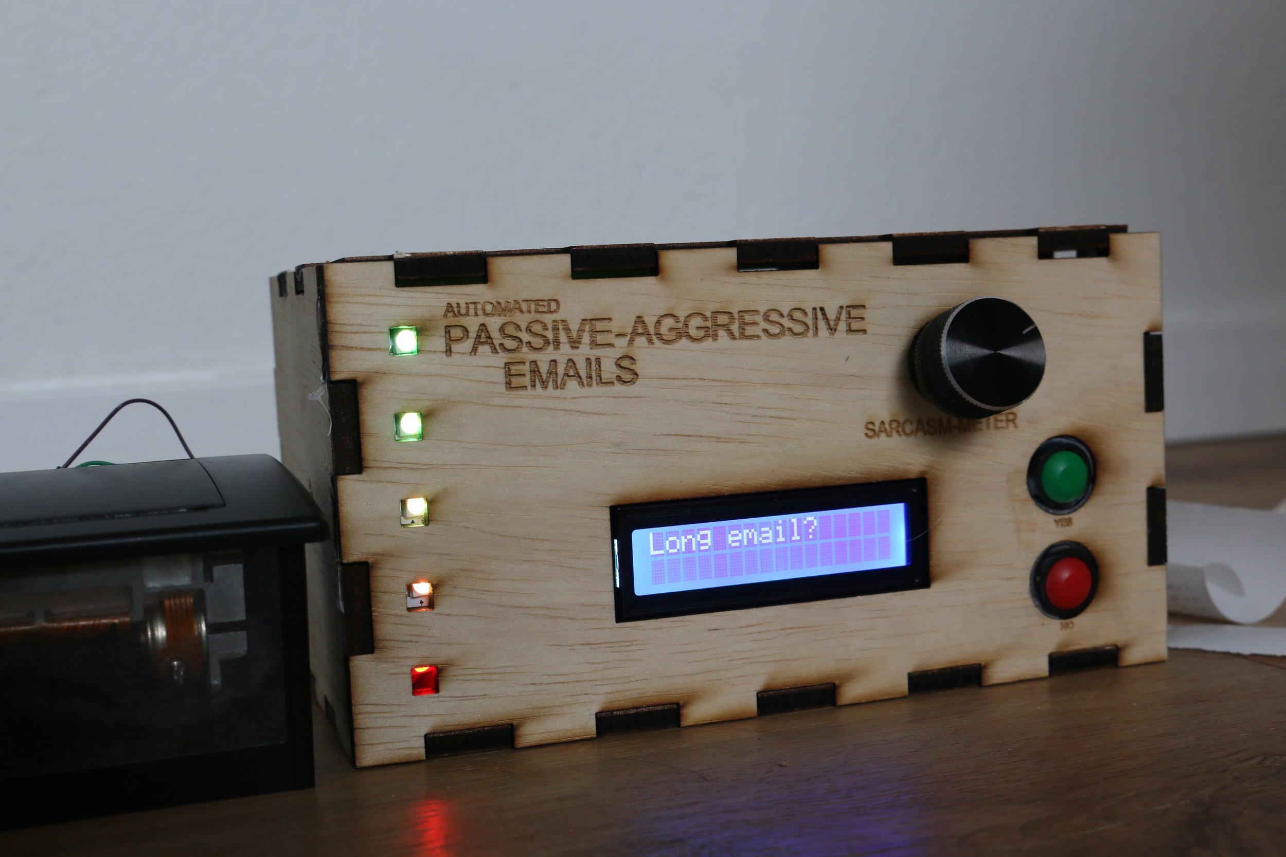 My way of alleviating this frustration is to create a machine to automate those emails. The system will ask questions to provide you with the perfect response to those annoying emails everyone hates to get. As an added bonus, the system can also be more or less sarcastic, depending on the ‘sarcasm-meter’. I wanted a way to add physical ‘character’ to the system, so a servo is set to go off every few minutes. The servo pops up, opening the top of the box, so that the user can see the googly eyes attached to the top of the box. I wanted it to feel like something ‘lived’ inside of the box that you are interfacing with, instead of just answering questions on a computer screen. A neopixel strip animates while the box is ‘thinking’ to provide feedback when you press a button.